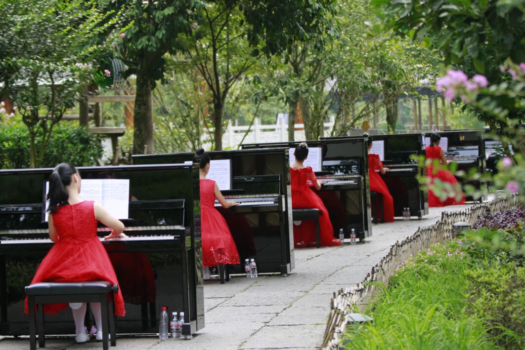 与此同时,天子山下15公里外的黄龙洞景区,118台钢琴和合唱团千人在哈利路亚音乐厅屋顶以及长满音符的稻田中,共同演绎《在希望的田野》、《浏阳河》、《欢乐颂》等名曲,为中外游客呈现世界首创的 “峰林天籁”。