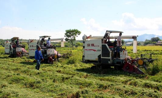 金色的阳光下,三台大型联合收割机在这片稻田里来回驰骋,一会儿功夫,几十亩稻田就被收割完毕。看着从收割机上不断涌下的谷粒,站在运输车上的唐亚超脸上充满了喜悦之情。