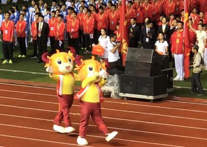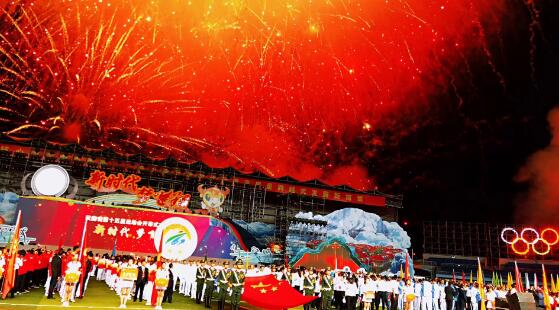 五彩斑斓的焰火霎时照亮体育场上空,现场气氛渐入高潮。在省十五届运动会会歌伴奏声中,省运会会旗和省十五届运动会旗升起,火炬点燃。