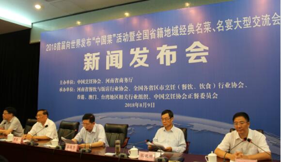 【香港商报网讯】记者王皓萍 报道:8月9日上午,河南省商务厅联合中国烹饪协会召开新闻发布会,公布了9月9日至12日,2018向世界发布‘中国菜’暨全国省籍地域经典名菜、名宴交流活动将在河南郑州举行,来自全国各个省份(直辖市、自治区、特别行政区)的地方经典名菜、名宴将齐聚中原,向世界诠释何为“中国菜”。
