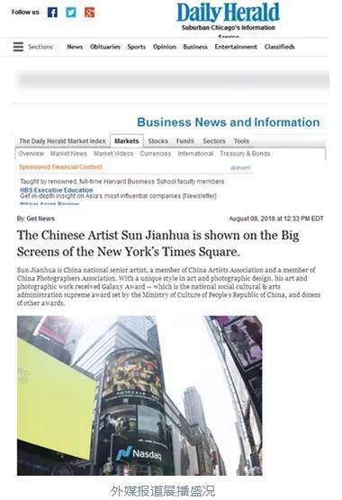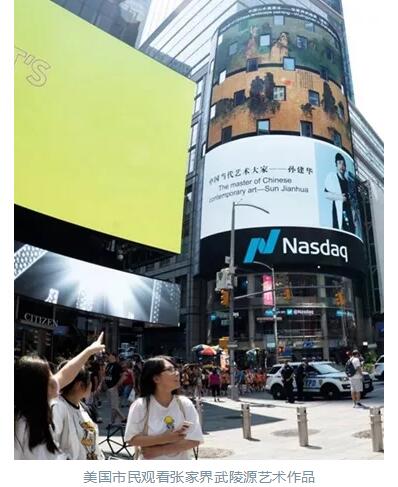 8月6日至10日,张家界武陵源风光美术、摄影作品在美国纽约时代广场纳斯达克巨型显示屏上滚动展播,受到了当地市民的高度关注。据了解,这些张家界艺术作品均由中国艺术家孙建华创作,美国及欧洲多家媒体对展播盛况进行了广泛报道。
