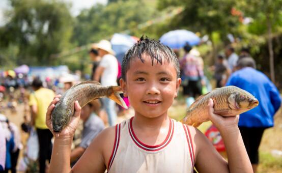 贵州省从江县斗里镇马安村乌育河,一名小孩展示自己抓到的鲤鱼。