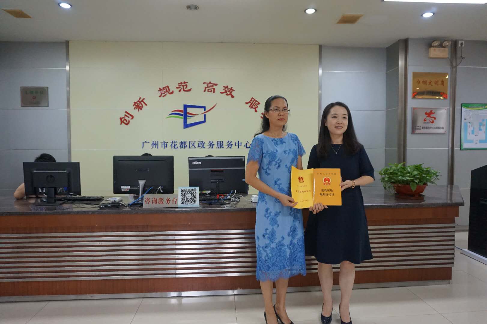 花都区积极优化营商环境,深入推进落实“放管服”改革,花都区国规局为进一步优化建设工程项目国土规划审批流程,促进审批服务提质增效,从2018年8月开始实行部分国土规划审批事项合并办理。在改革前,企业办理这2个证,至少需要跑2次政务窗口、2次递件、需要40个工作日。如果申请材料不符合要求的,那这个办理期限就更长。这次区国规局实行审批合并办理,将40个工作日压缩到了3个工作日,提速93%,大大提升建设工程项目审批效率、降低企业经营成本。广州花都汽车城发展有限公司代表表示,周一正式拍到该地块,周三到区政务中心综合窗口正式入件,周五就拿到了证照,速度惊人!