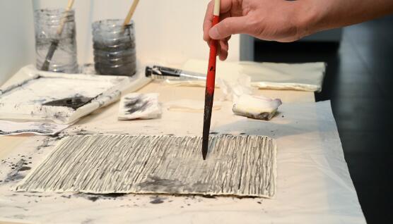 柯济鹏的作品,可以看到一条条的黑色和白色平行线,不断延伸、不断覆盖,如同国画的积墨技法。但在柯济鹏眼中,积墨则是一种“累积”的行为。“我想收集时间,物化时间,但时间是虚无的”,柯济鹏称,积墨可以实现物化的表达,每一遍的积累,呈现出不一样的走向和肌理,诠释时间遗留下来的痕迹和污迹。之所以称之为“无限”,柯济鹏说,时间没有办法裁剪,它没有开始也没有结束,只有无限的延伸,以及“偶然的”时间点。