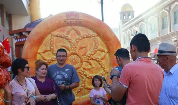 游客在新疆国际大巴扎夜市门口,与“馕”合影。 黄萍 摄