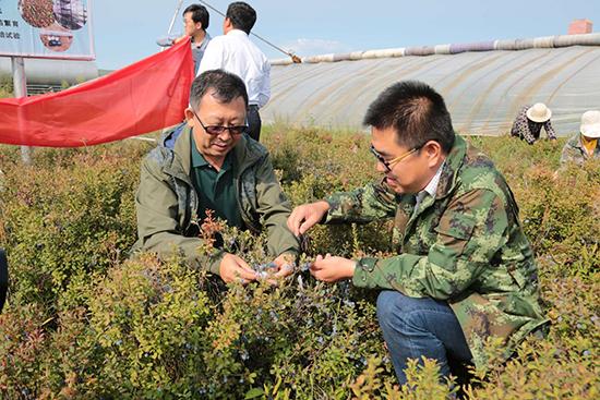 黑龙江省科学院自然与生态研究所研究员张悦(左一)、副研究员魏电文(右一)两位蓝莓专家,正在为阿木尔林农科技园人工栽培的野生蓝莓打标签