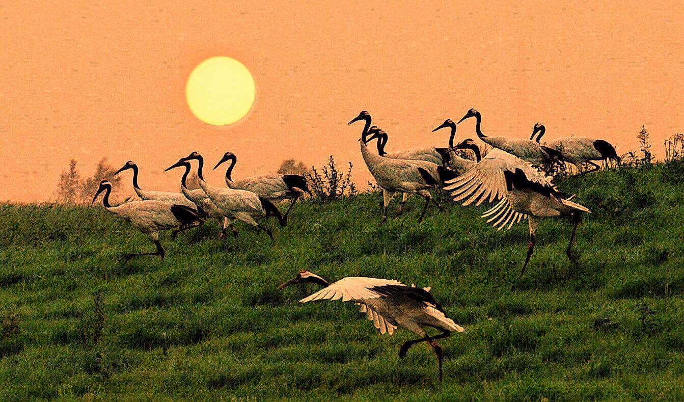 伴随着耳熟能详的歌曲《丹顶鹤的故事》,助跑、展翅、起飞,数十只丹顶鹤排着整齐的队列从山坡上一飞冲天,俯视一望无际的芦苇荡,不时传来阵阵欢快的鹤鸣。