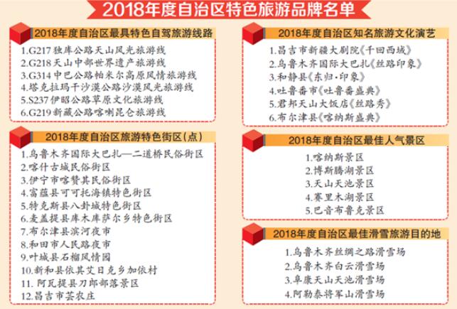 该名单经自治区旅游协会综合评定推荐,自治区旅游发展委员会同意发布。具体包括:6条自治区最具特色自驾旅游线路,12个自治区旅游特色街区(点),6项自治区知名旅游文化演艺,5家自治区最佳人气景区,4个自治区最佳滑雪旅游目的地。