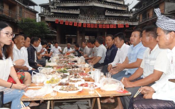 黄斌与村民们一起吃长桌宴席为大学新生们饯行