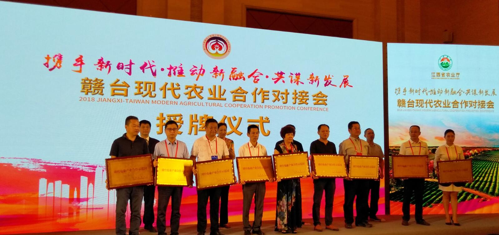在本次赣台现代农业合作对接会上,举办了首批“赣台农业产业合作示范园”授牌仪式,授牌认定了9家赣台农业产业合作示范园,分别是:南昌市蒋巷示范园;南昌市蒋巷区示范园;湾里区示范园;萍乡市湘东区示范园;鹰潭贵溪市白鹤示范园;赣州市龙南县示范园;宜春市上高县示范园;上饶市鄱阳县示范园;吉安市冀州县示范园;抚州市资溪县大觉山示范园。