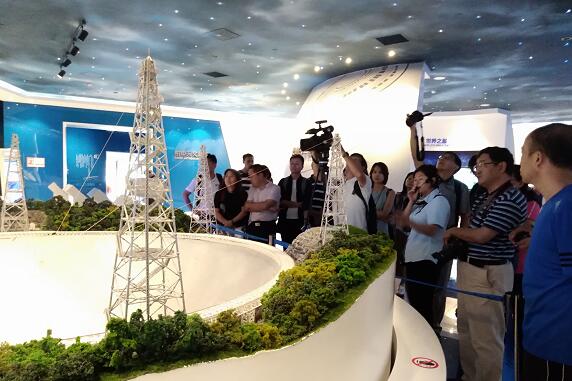 参访团在参观完平塘国际天文体验馆后,乘坐景区观光车,经过约半个小时的崎岖山路,到达中国天眼所在的喀斯特洼坑山脚,再攀?89级阶梯到达观景台,才真正见到了这个伟大工程的真面目,非常壮观。据了解,天眼的综合性能,是著名射电望远镜阿雷西博的十倍?/p>