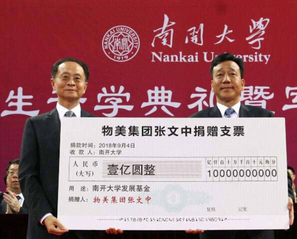 【香港商报网讯】记者 邢宝华 通讯员 聂际慈 报道:9月4日,在南开大学南开大学2018级本科新生开学典礼现场,应邀出席的南开大学校友、物美集团创始人、南开大学客座教授张文中宣布向母校捐赠人民币一亿元,并向南开大学党委书记杨庆山递送捐赠支票。杨庆山代表南开大学捐赠支票,并向张文中颁发捐赠纪念牌。