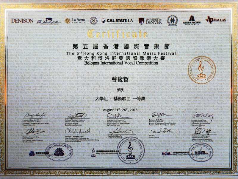 2018年8月21日至27日举办的第五届香港国际音乐节暨意大利博洛尼亚国际声乐比赛,为促进中国声乐发展与国际声乐教育真正接轨,为学习美声唱法的学生、教师、艺术人才搭建一个国际性的交流平台。大赛组委会邀请来自全球著名的歌唱家、声乐教授、指挥家、音乐艺术指导、歌剧院总监、音乐经纪人作为评审团,旨在为中国的古典美声,歌剧等声乐人才提供国际性的比赛,助推中国声乐人才快速成长,为中国歌剧行业“输血造血”。在亚太赛区总决赛中,曾俊哲凭着良好的感觉和多年来不懈努力打下的坚实基础,以细致的音准、优雅的形体表现,最终杀出重围,勇夺大学艺术歌曲桂冠!