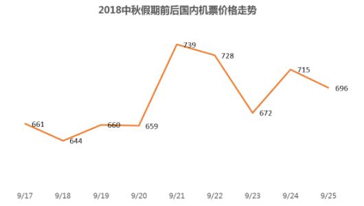同程艺龙发布的数据显示,中秋假期前后国内机票的价格呈现明显的“潮汐”特征,节前客流高峰预计将出现在9月21日,这一天的平均票价也是假期期间最高的,不含税费的机票均价为739元。9月24日为节后返程高峰,但客流集中度相对节前略有下降,平均票价为715元(不含税费)。
