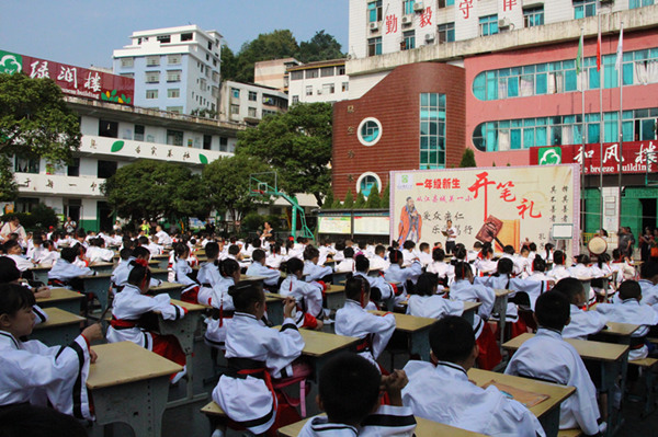 6日,贵州省从江县城关第一小学为该校200余名一年级新生举行庄重的“开笔礼”仪式,让小学新生从小接受中华民族优秀传统文化的启蒙,感知入学是人生中的一件大事,树立勤勉好学的意志。在老师的引导下,新入学的一年级新生们走过“开笔”大道,先后完成了“正衣冠”、“启蒙拜师”、“朱砂启智”、“击鼓鸣志”、“启蒙描红”等五个仪式环节后,在老师的指教下孩子们认认真真开笔书写了自己人生中的第一个“人”字。