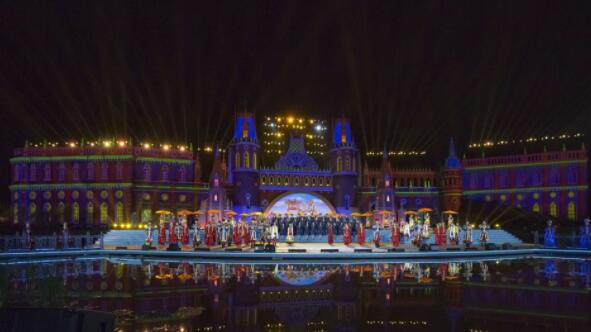 今年,中俄艺术家大联欢的演出场地首次来到室外,取景于富有俄罗斯风情的伏尔加庄园,主舞台则依水而建,观众席则设置在了山坡上——山丘秀美如画,水流充满灵动,搭配园区的俄式建筑,使用激光投影等现代化手段制作楼体秀,所有元素搭配在一起,为观众呈现出了一幅幅美轮美奂的绚丽奇景,极富视觉冲击力。