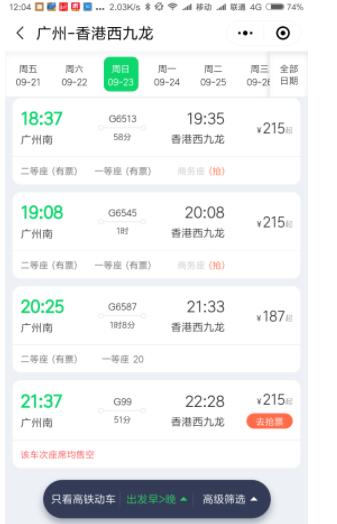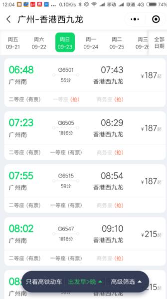 经查询获知23日到10月2日分别从广州南至香港西九龙共34个车次,深圳北、福田至香港西九龙92个车次的车票。顾客可以选择自己所需的车次,按相关提示操作即可进行车票预订。或许是恰逢中秋、国庆佳节,查询显示23日相关车次车票一开售就掀起了小高潮,目前 G311次和G99、G6113、G67次等多趟车次车票已经售空,其他车次一等座、商务座比较抢手,不少车次开始了抢票节奏,全部车次的二等座票也都只剩20张左右。