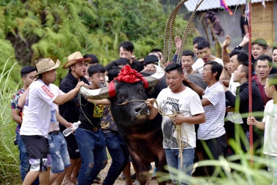 在貴州省從江縣丙妹鎮五堂松學斗牛塘,人們牽著斗牛准備打斗。 (吳德軍攝)