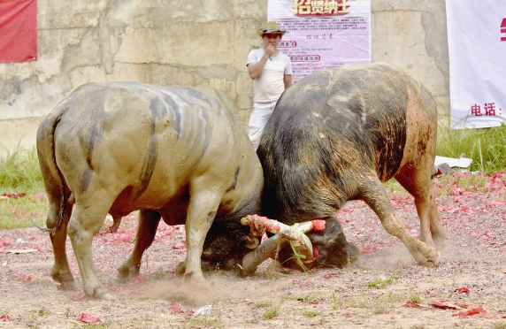 在貴州省從江縣丙妹鎮五堂松學斗牛塘,兩頭斗牛正在打斗。 (吳德軍攝)