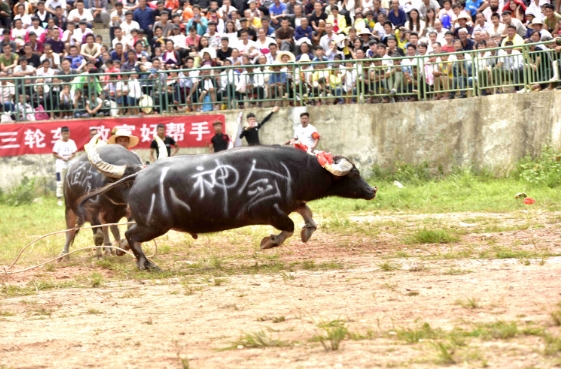 貴州省從江縣丙妹鎮五堂松學斗牛塘,一頭斗牛不敵落荒而逃。 (吳德軍攝)