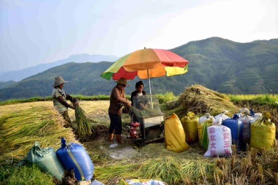 在貴州省從江縣丙妹鎮大塘村,苗族村民在脫離稻谷。 (吳德軍攝)