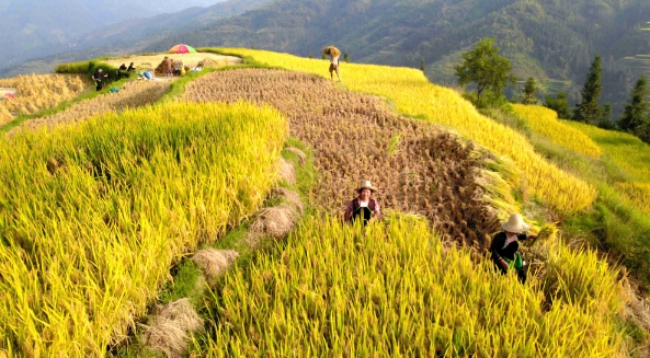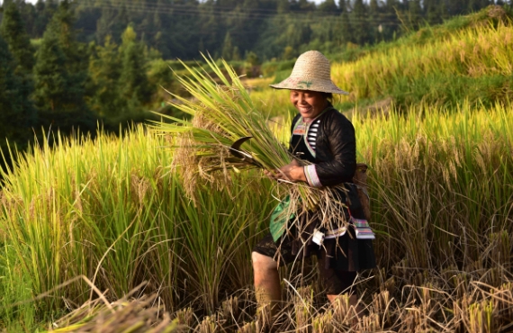 貴州省從江縣丙妹鎮大塘村,苗族村民在收割水稻。 (吳德軍攝)