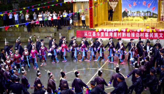 :17日,贵州省从江县斗里镇湾里村举行黔桂相邻村寨民族文化联谊活动,斗里镇和与其相邻的广西融水县大年乡、良寨乡苗侗族群众相聚湾里村,踩歌堂跳“哆耶”、观看芦笙踩堂、侗族琵琶歌演唱、侗戏表演等活动,共同庆祝丰收,迎接中国首个农民丰收节。
