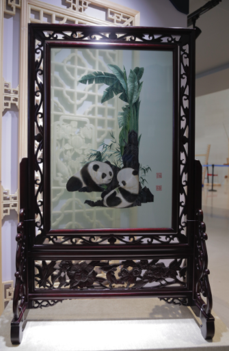 所谓三异绣,即异形、异色、异法,在一张绣布的两面用不同的颜色不同的针法绣不同图案,难度巨大。这幅工笔风格的作品,一面是西汉文学家司马相如为卓文君弹琴的场景,一面是一对憨态可掬的熊猫在玩耍。