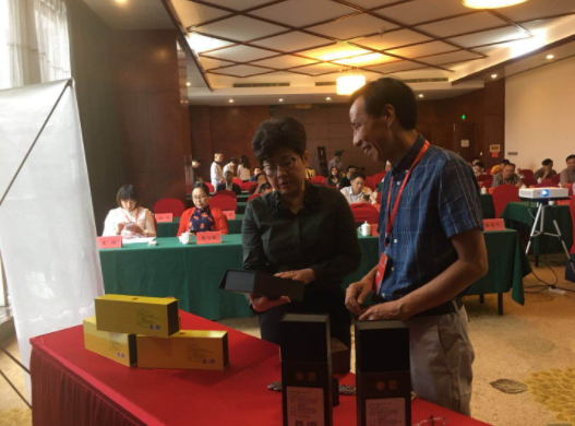 研討會現場、湖南省渠江薄片茶葉有限公司董事長陳建明向新化縣副縣長文瑾介紹新產品