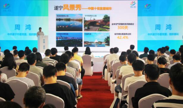 遂寧市委常委、組織部長周鴻向全國各地高校學子進行宣講,他介紹了遂寧的基本情況和人才政策,並向武漢大學以及全國各地高校優秀人才發出“邀請函”。周鴻表示,近年來,遂寧市認真貫徹落實習近平總書記關於人才工作的重要指示精神,大力實施人才強市戰略,以“遂州英才七大計劃”和“萬名人才集聚工程”為工作重點,全市人才事業實現突破發展。自2013年以來,遂寧市每年集中組織全市企事業單位赴高校開展遂州英才組團招聘活動,成功吸引近萬名優秀人才來遂寧創新創業。