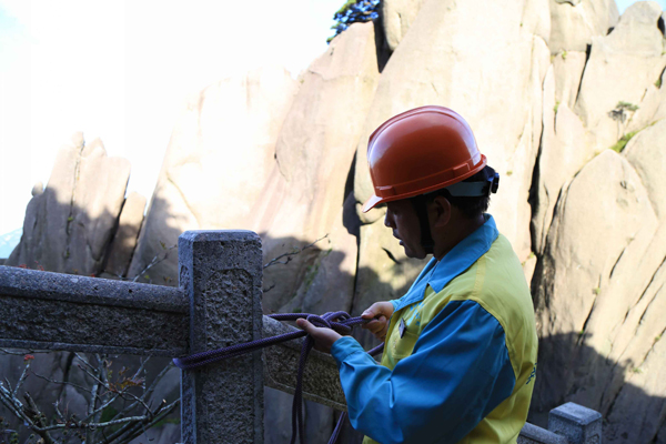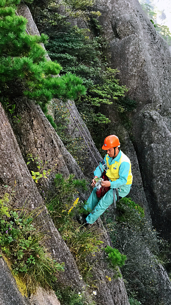 10月1日,在去往迎客松景点的一处新开发的游步道上,年近五旬的李培生正在和同事一起仔细检查身上的放绳装备。几分钟后他将在90度的垂直悬崖上进行国庆当天的最后一次高空工作。