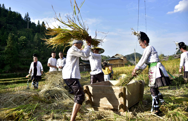 【香港商报网讯】通讯员 吴德军 报道:10月1日,在素有“侗歌窝”的贵州省从江县高增乡小黄村除了演唱侗族大歌外,还开展打谷子、耕牛耙田、捉鱼、捞鱼虾等农耕文化体验活动,吸引众游客前来。