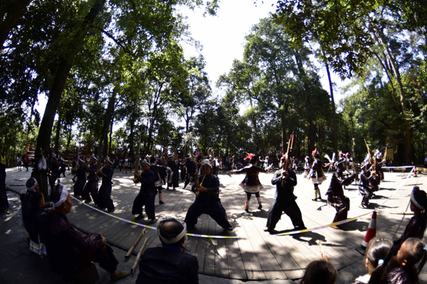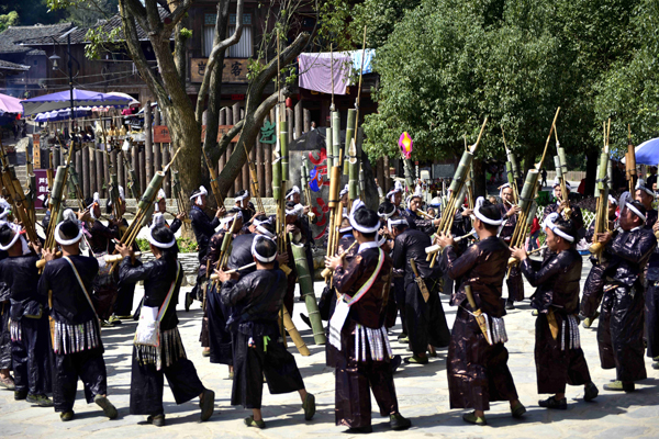 【香港商报网讯】通讯员 吴德军 报道:国庆假期期间,贵州省黔东南苗族侗族自治州从江县岜沙苗寨吹芦笙、鸣枪迎宾、跳芦笙舞、抢婚民俗、镰刀剃头等一系列富有当地苗族风俗、风情的节目欢度国庆佳节,吸引了来自全国各地的游客。