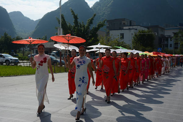 当天,屯里上演了一场隆重的“姐妹回娘家”活动:100多名外嫁女集体从外地回来与娘家人团聚,大家身穿旗袍,撑着油纸伞载歌载舞,共叙思乡之情,场面震撼。