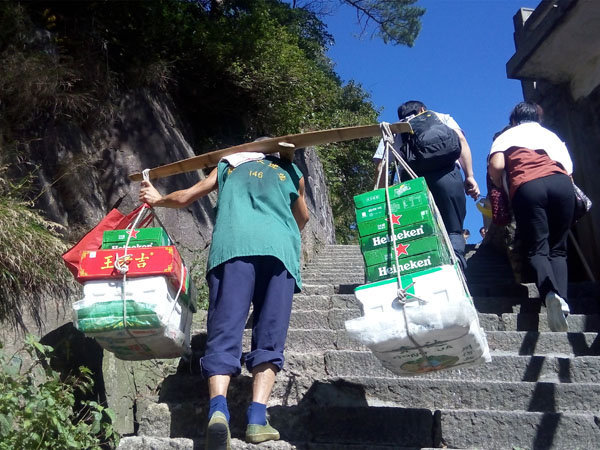 上百斤物资正是他们用勤劳运输上山,数千级台阶正是他们用汗水跨越攀登。人群中,他们负重前行,只为将新鲜的蔬菜、水果挑上山巅,让游客饱览大好风光的同时也能大快朵颐。