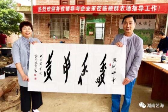 書畫交流會上,年逾七十的朱建南老師,精神矍鑠,手執狼毫,用筆千鈞,行雲流水,一氣呵成--“寧靜致遠,淡泊清心”八個大字倏地躍然紙上。許國章院長瀟灑揮筆,寫下 “厚德載物,德善福樂”,字跡遒勁有力、力透紙背。女書傳人周荊兒當場創作女書,“愛我中華,惠風和暢”,似蝌蚪遊動,又似螞蟻佈陣,運筆剛柔相濟,富有靈韻。周兆平老師潑墨丹青,技法嫺熟。“愛蓮說”等作品栩栩如生,出淤泥而不染的高雅畫面,正好迎合了穎群農莊的生態美感。