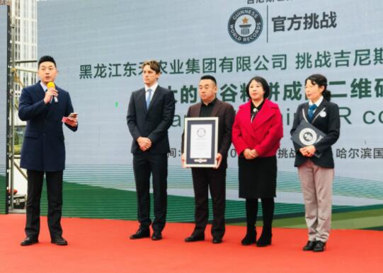 10月10日,東禾集團用黑米和白米擺製二維碼,又將2018中國·黑龍江首屆國際大米節活動推向高潮。該穀物二維碼長寬各30米,由黑白大米各5噸擺製而成,歷時四天擺製而成。在當天上午,成功挑戰吉尼斯世界紀錄,獲得“最大的由谷粒拼成的二維碼圖形”稱號,並舉行了頒證儀式。
