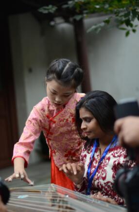 中國小朋友為外國友人示範彈古箏