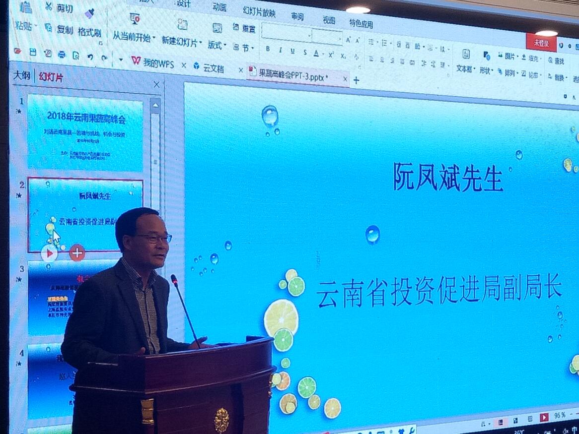 雲南省投資促進局副局長阮鳳斌在致辭中表示,雲南果蔬產業發展離不開省外企業的投資。據介紹,雲南蔬菜通過湖南蔬菜流通企業與個人的努力推廣占了中國的“半壁江山”;雲南的葡萄大部份是由浙江商人投資種植的;雲南部份熱帶水果是福建、廣東企業種植的;雲南的蔬菜一部份是山東企業種植、一部分是重慶商人種植。這些自發的投資正是對雲南得天獨厚的氣候資源的認可。