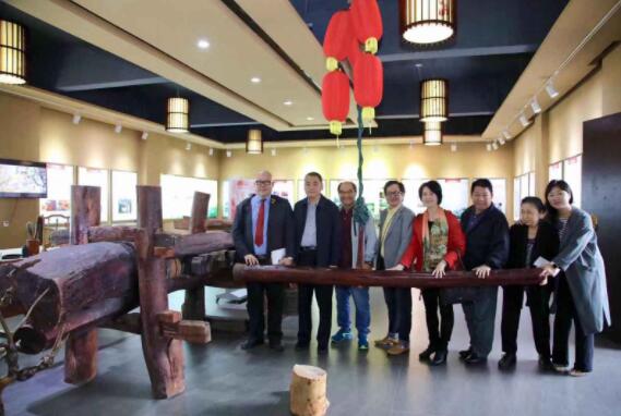 考察團成員在大三湘文化館的鎮館之寶紅龍榨機前合影留念。余文輝 攝