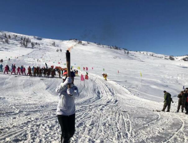在阿爾泰山雪山之巔,我國第一位全國滑雪冠軍、中國滑雪協會技術顧問單兆鑒點燃了冰雪聖火,曾榮獲自由滑雪空中技巧首個世界冠軍的我國著名滑雪運動員郭丹丹率領國家滑雪隊新疆組滑雪運動員滑雪將火炬從山巔傳遞到山下,高志敏、侯漢敏、哈丹·卡賓、薑世才和郭丹丹共同點燃了主火炬,熊熊燃燒的火焰預示著新疆冬季旅遊在新的雪季必將紅紅火火。
