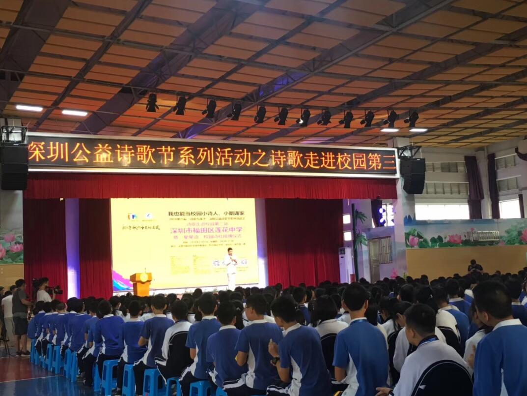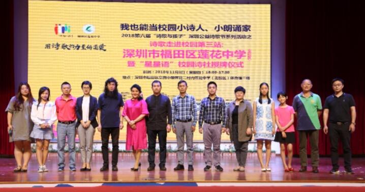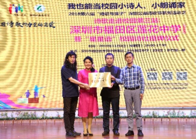 【香港商報網訊】继深圳市福田区教育科学研究院附属中学和绿洲小学之后, 2018第六届“诗歌与孩子”深圳公益诗歌节系列活动之诗歌于进校园活动于11月1日下午走进第三站:深圳市福田区莲花中学(北校区),同时莲花中学“星星语”校园诗社也授牌成立。小诗人姜馨贺和朗诵老师李弼两位嘉宾,分别教500多位同学们如何写诗和朗诵诗歌。深圳市莲花中学(北校区)工会主席——王赢佑,深圳市第六届政协委员、深圳东方银座集团董事局副主席、深圳东方美术馆有限公司董事长、诗歌与孩子公益计划联合发起人——钟帆飞,诗歌与孩子公益计划联合发起人、珠三角首家原创移动微视频杂志《22点tv》创始人、零点星传媒控股集团创始人——卢茂新,分别进行了发言。