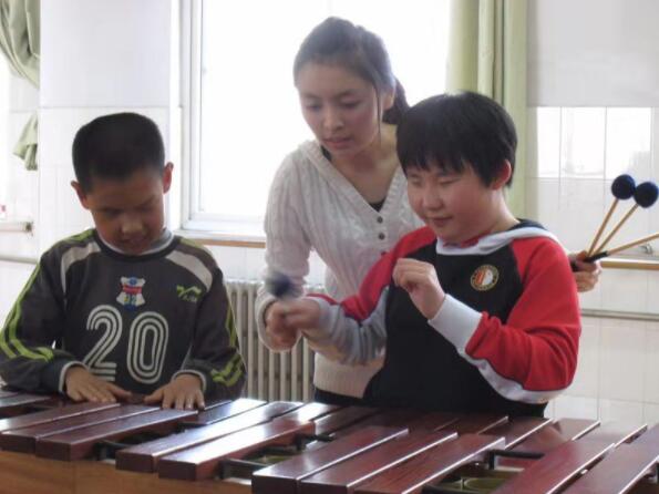 王宸在河南省鄭州市盲校演出後,手拉盲童的手撫摸樂器馬林巴