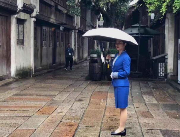 11月7日,第五屆世界互聯網大會正式開幕的第一天,細雨連綿。位於烏鎮的會議現場,圖為承擔此次大會志願者服務工作的一位“小梧桐”身著代表“烏鎮藍”的服裝,打著傘站在雨中。
