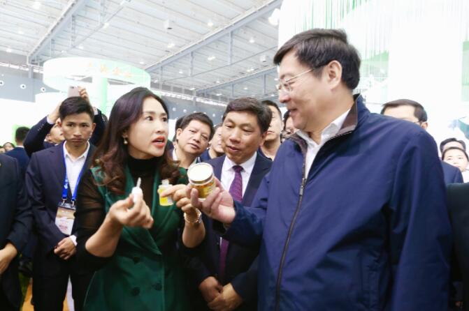 杜家毫在展位里對一瓶小小的膠囊表現出極大的興趣,當他得知這瓶膠囊是通過高新技術從茶油中提取高純度營養素製成時,對茶油“湘”字號企業能把普通茶油做得如此有科技含量贊不絕口,稱贊“把茶油產業做出了高度和精度!”。