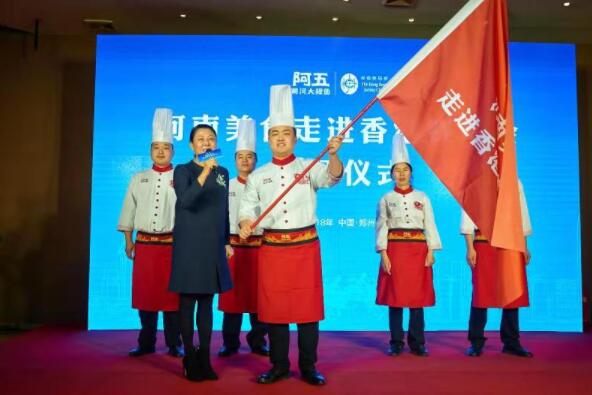 “濃香河南,香飄香江,瀟灑阿五,笑傲江湖,預祝阿五廚師馬到成功!”河南省商務廳副廳長李若鵬,現場為阿五送上了祝福。(蔡福鑫)