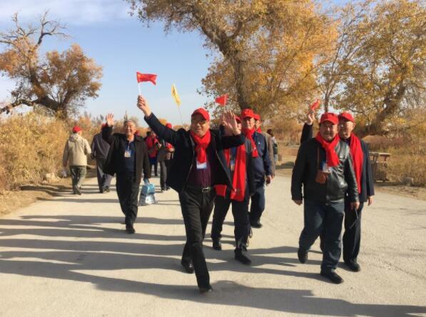 在塔里木盆地邊緣,全體老幹部還用隊伍站出“心”形,表達對祖國的熱愛,對新疆美好發展的贊同和支持,將一顆“紅心”獻給黨。