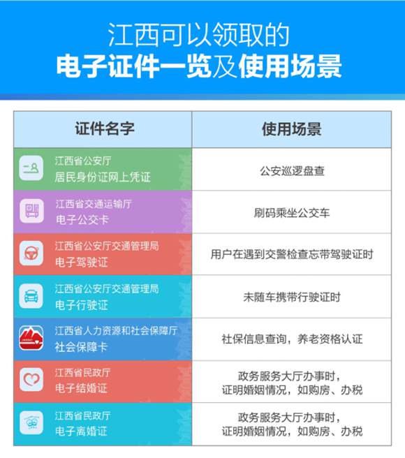 江西省大數據中心主任金俊平介紹,此次上線的還包括身份證網證、電子駕駛證、電子行駛證,江西也由此成為全國電子證件類型最多、覆蓋範圍最廣的省份,市民在政務服務大廳辦事時發現忘帶證件時,通過領取電子證件就可辦理,不再折返跑。