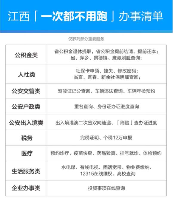 “贛服通”上線后,江西人只要打開支付寶就能"一號申請、一次登錄、一網辦理”110項政務服務,包括水電煤繳費、公積金查詢提取、交通違法查詢、個稅申報、預約掛號就醫等,是建設“數字江西”的又一項重要舉措。