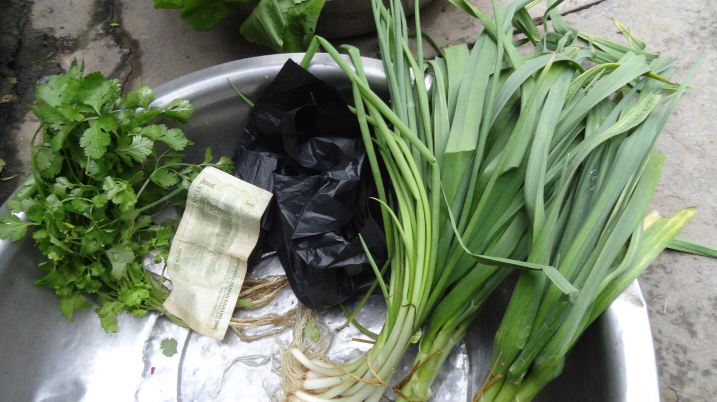 11月15日,在貴州省從江縣谷坪鄉穀洞村菜市上拍攝的“無人菜攤”,盛放在盆裡的蔥花、香菜、大蒜每把一元錢。(梁雨 攝)